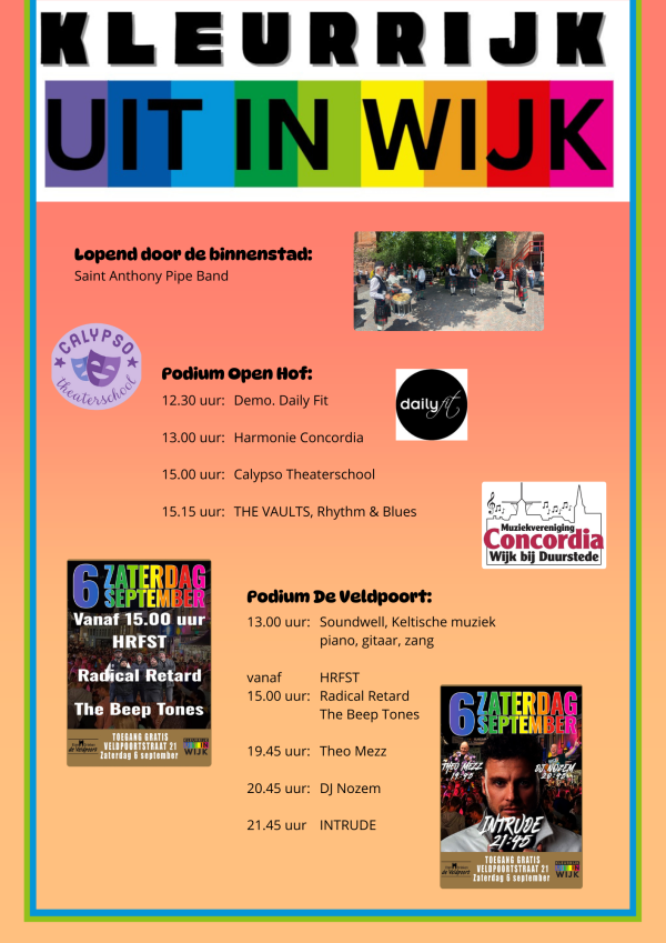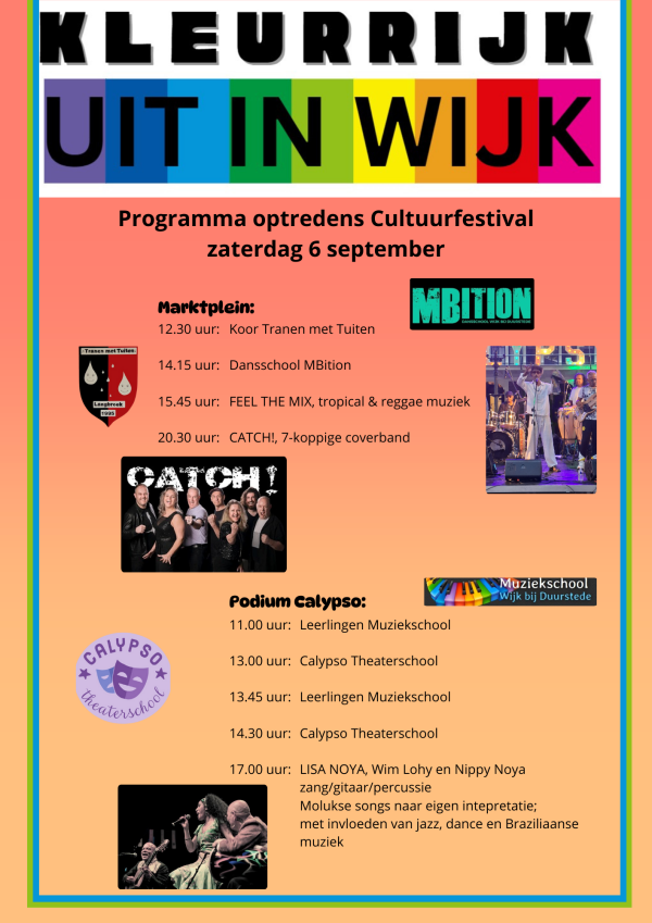 Het Cultuurfestival vindt plaats op zaterdag 6 september tussen 11.00 - 18.00 uur. Tijdens dit festival kun je meedoen aan verschillende workshops/activiteiten en genieten van leuke optredens. Een overzicht van de workshops, de overige deelnemers aan de Cultuurmarkt en het programma van de optredens tijdens het festival, vindt u hieronder.
